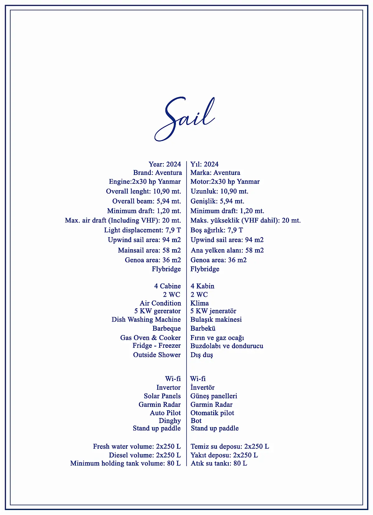 Wi-Fi & Internet, Air condition, Dinghy, Barbecue grill in cockpit, Refrigerator, Solar Panels, Inverter, Generator