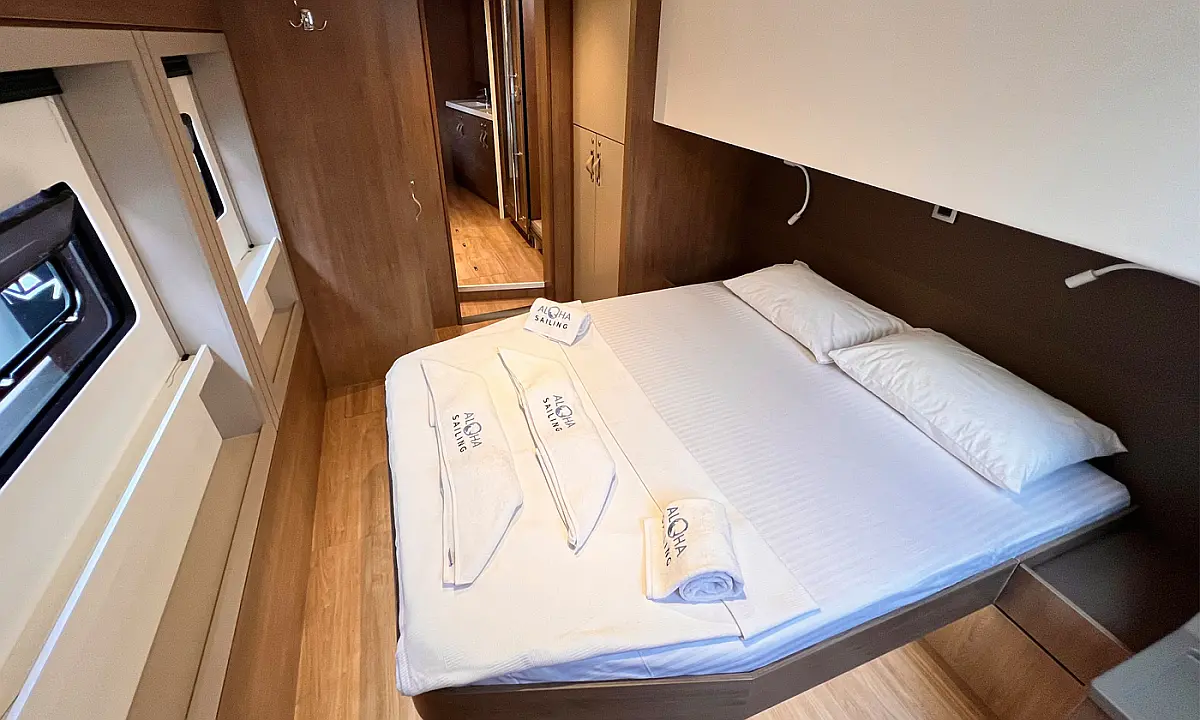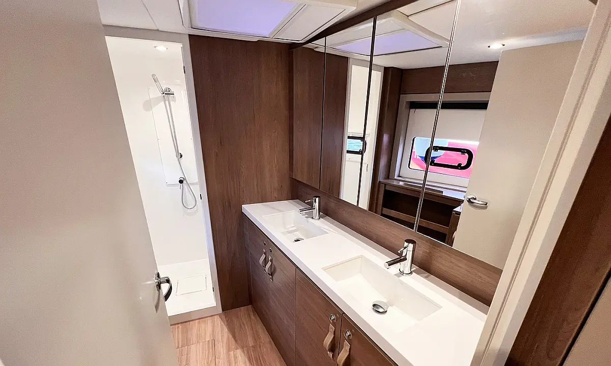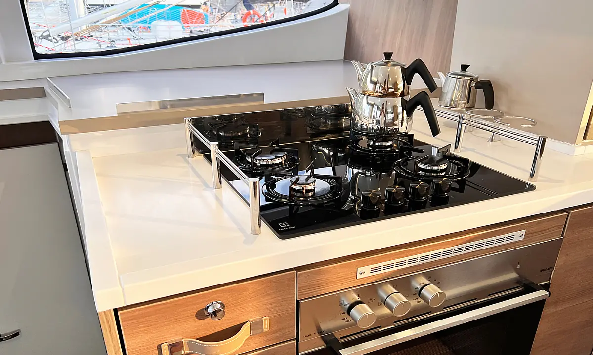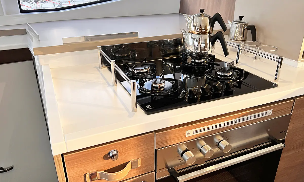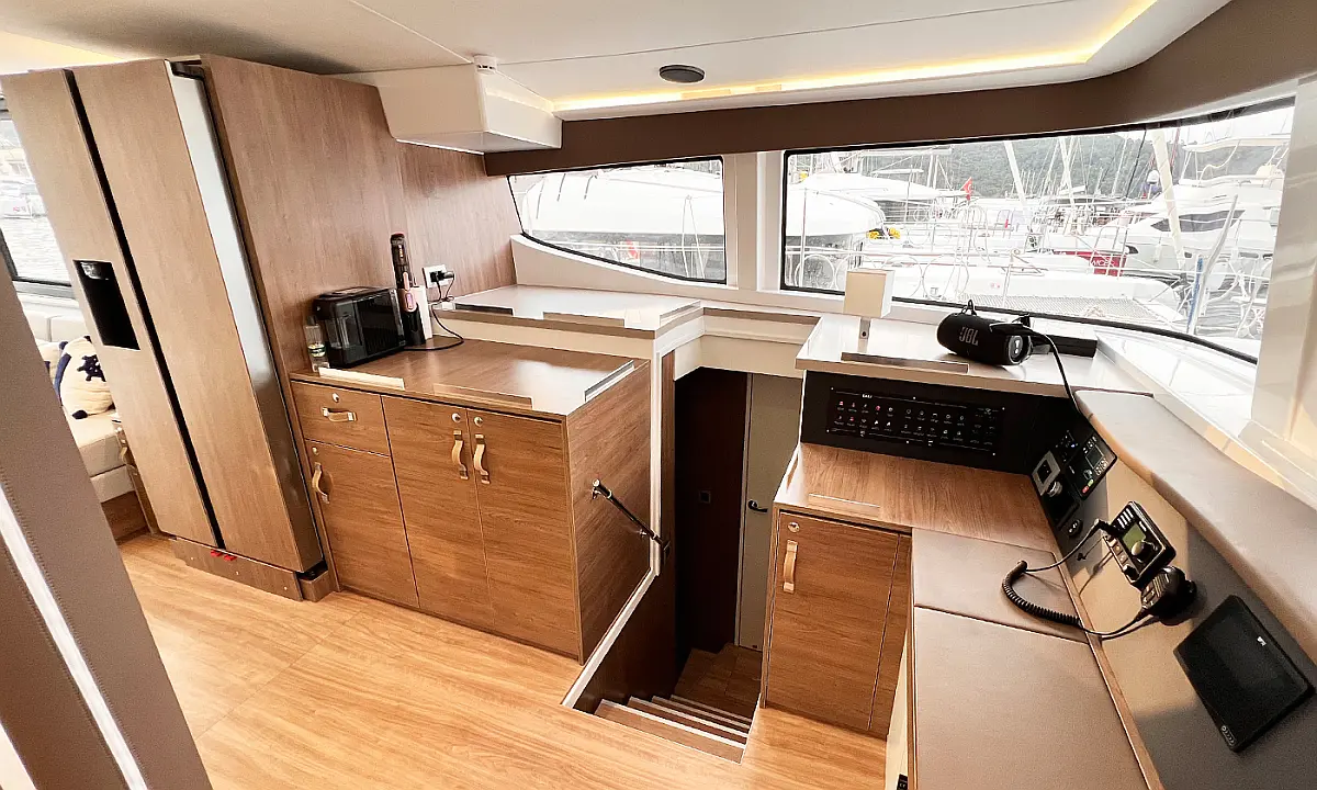 Refrigerator, Electric toilet, Cockpit cushions, Air condition, Water maker, Inverter, Generator, Solar Panels, Coffee maker, Heating, Electric winches