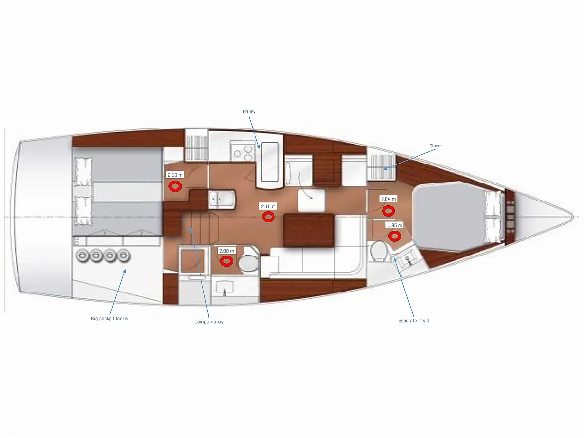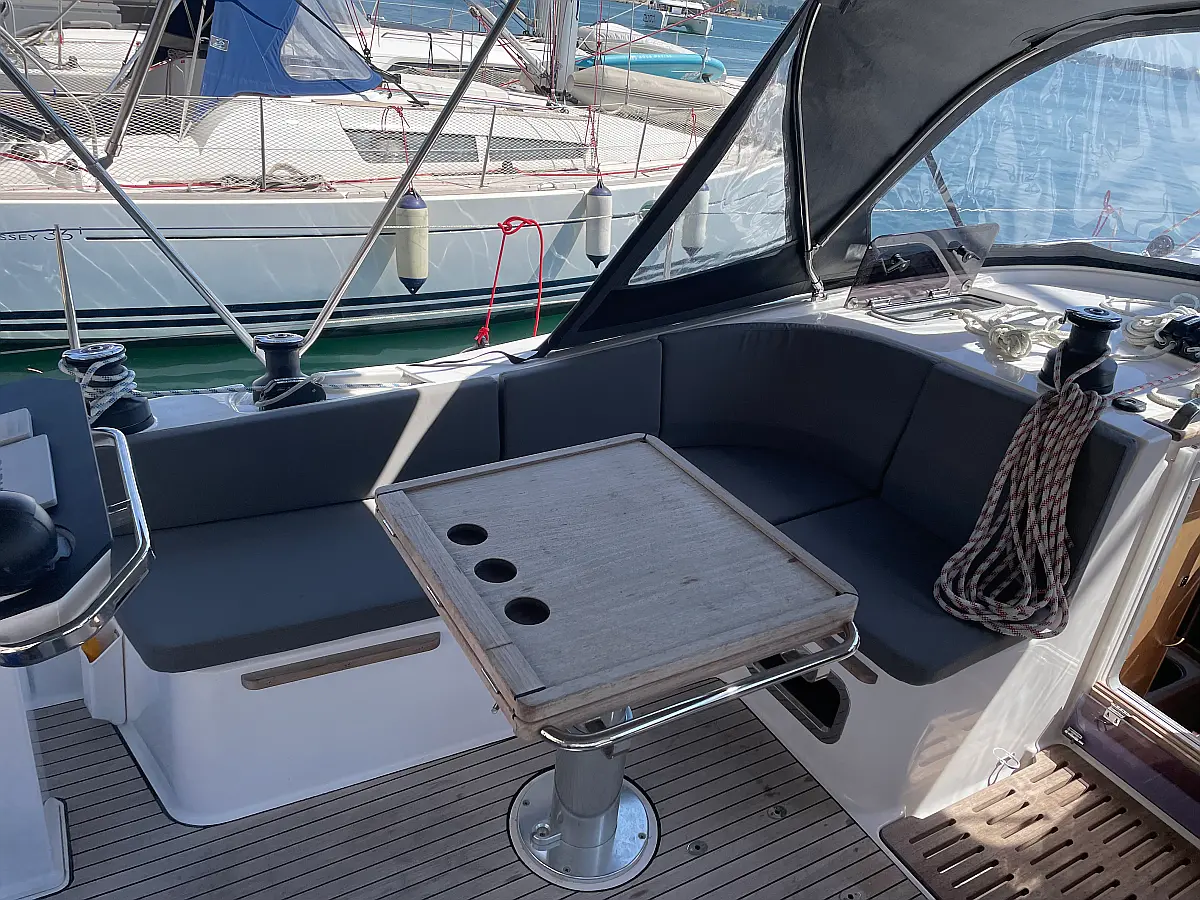 Electric toilet, Bimini, Cockpit cushions, Sprayhood, Teak Cockpit, Refrigerator, Inverter, Solar Panels, Dinghy, Electric winches