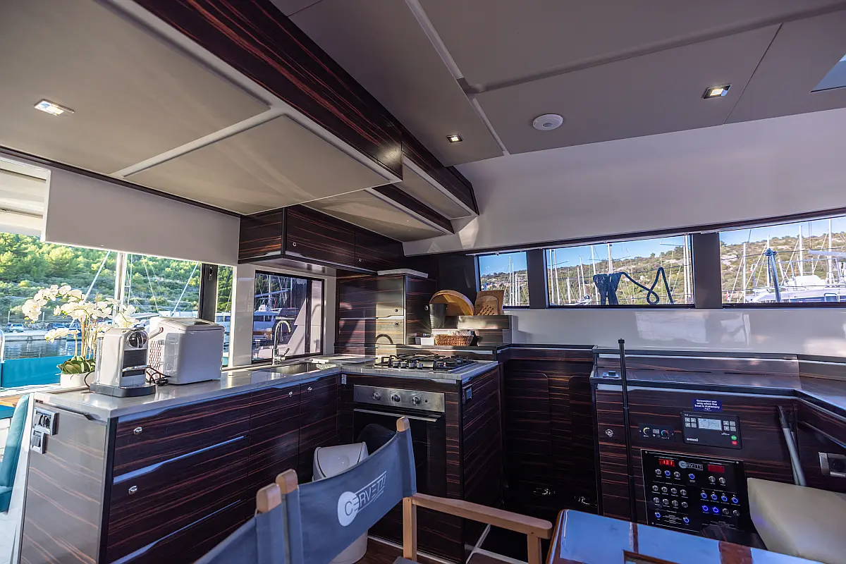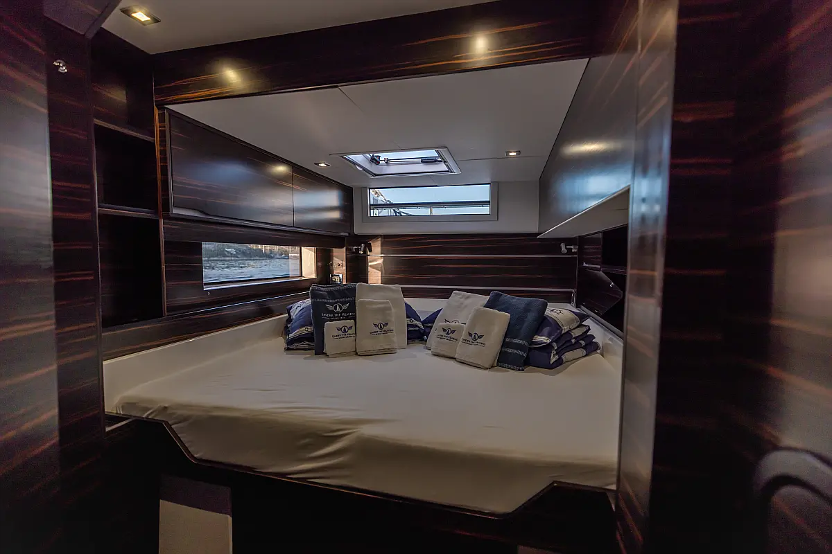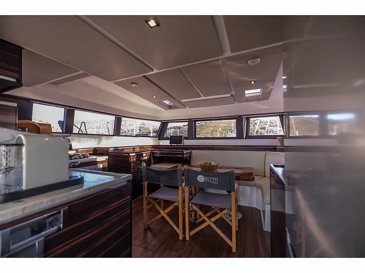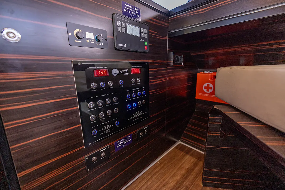 Air condition, Water maker, Electric winches, Dinghy, Generator, Solar Panels, Hydraulic gangway, Teak deck