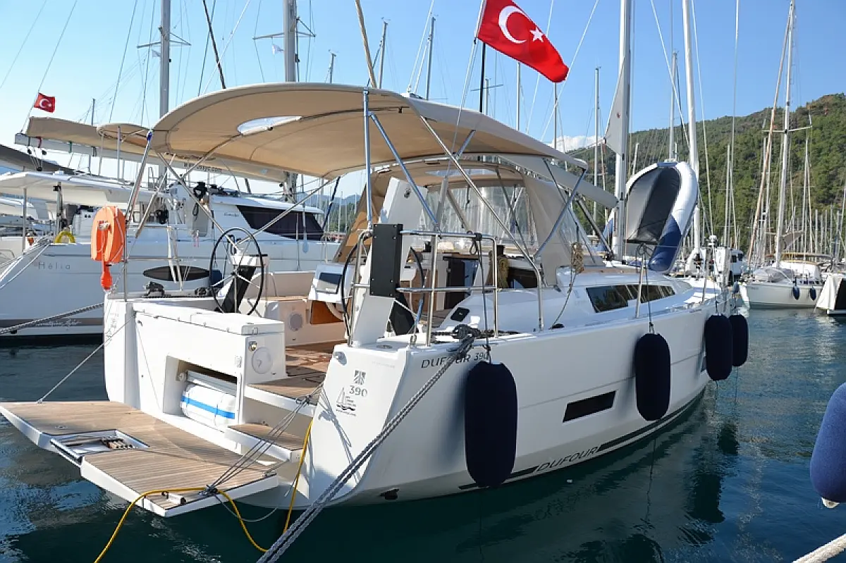 Refrigerator, Dinghy, Swimming platform, Cockpit cushions, Sprayhood, Teak Cockpit, Bimini