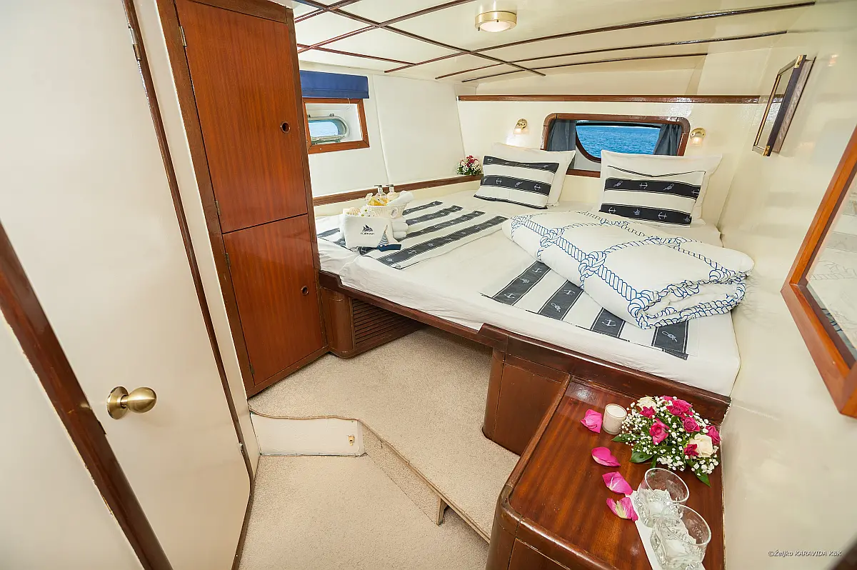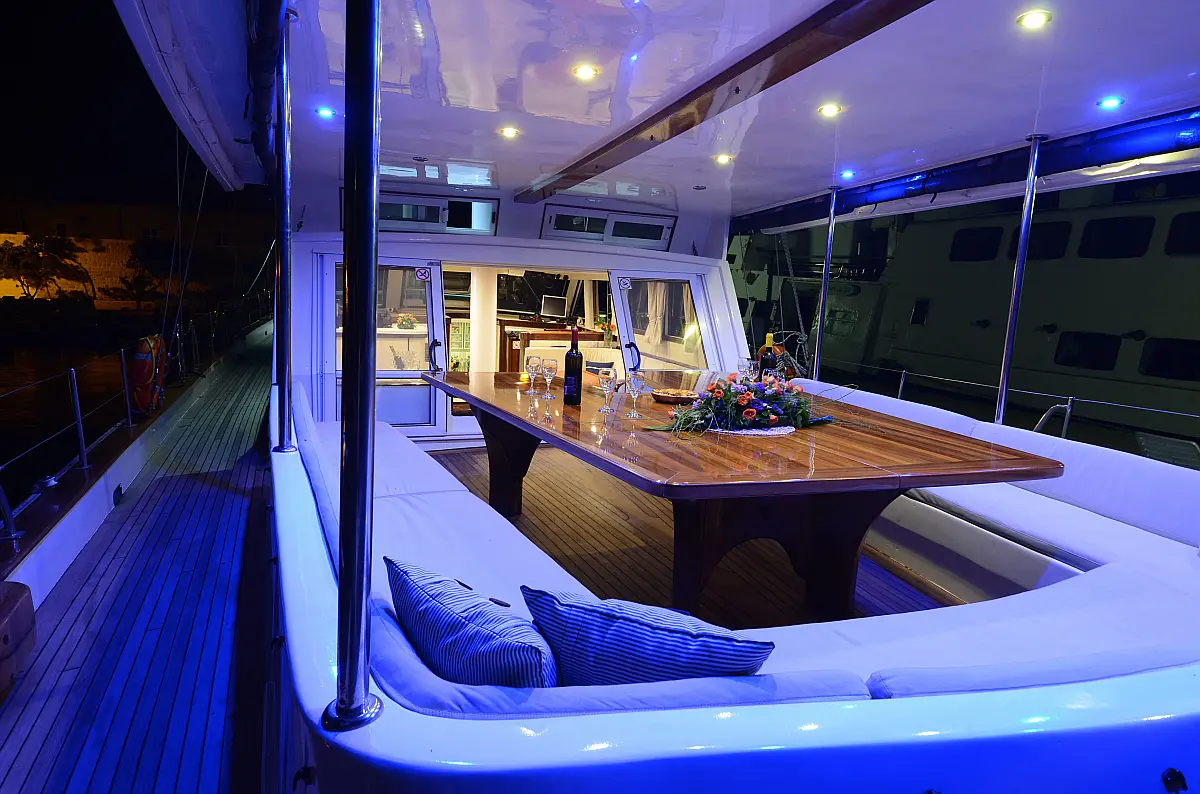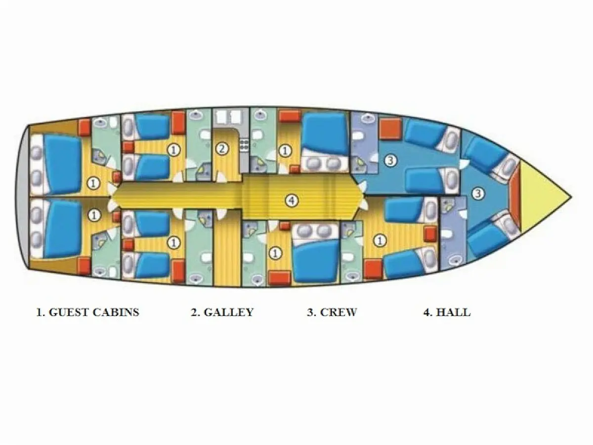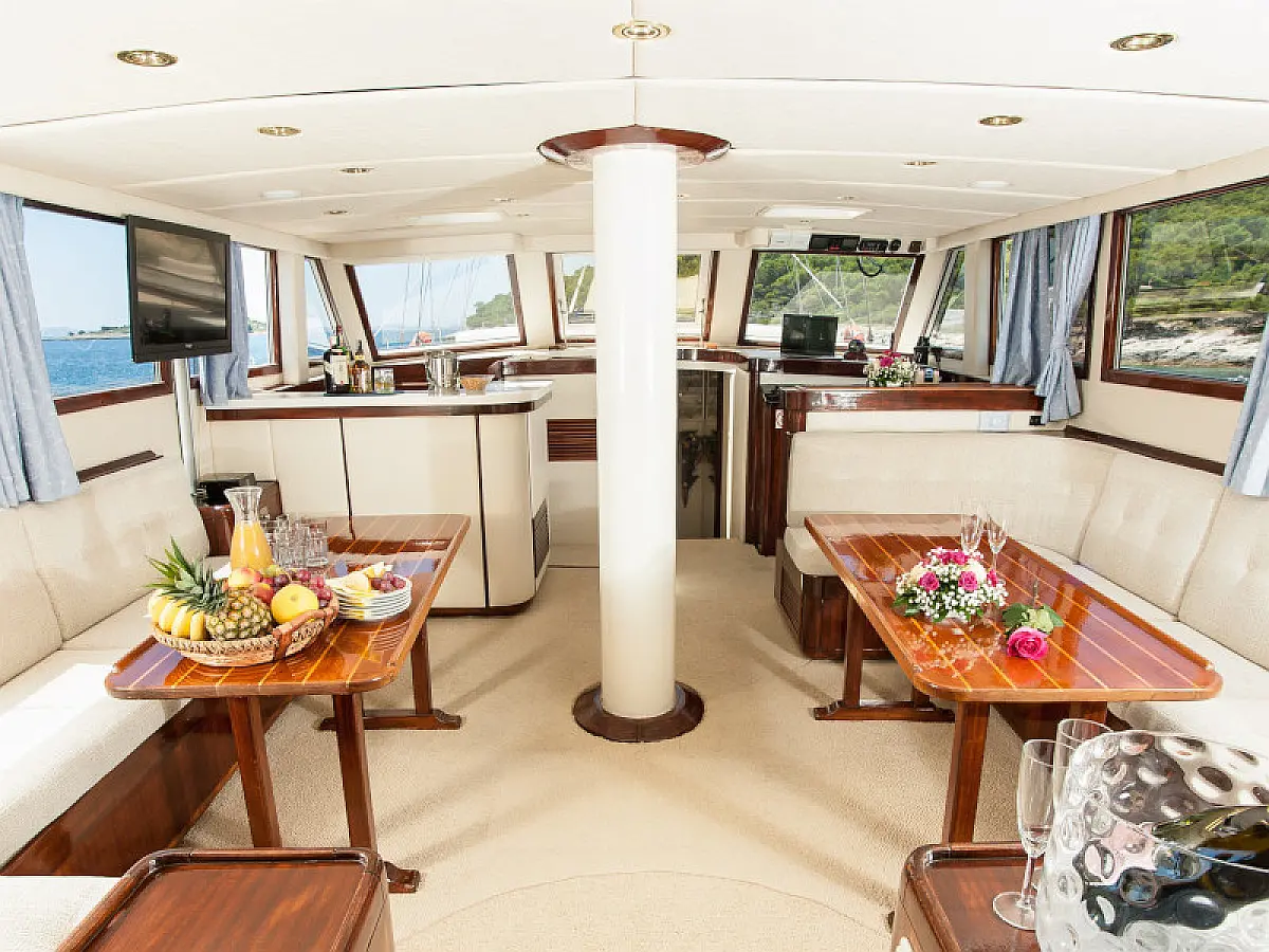 108 ft Length 6 Cabins 12 Max Guests 7 Heads Technical Specifications Draught: 11 ft Engine: 2x306 HP Volvo Penta Water capacity: 4000.00 l Main sail: None Displacement: N/A Fuel capacity: 7000.00 l Beam: 21 ft Genoa: None Equipment Comfort: Coffee maker, Refrigerator, Ice maker, Air condition, Wi-Fi & Internet Entertainment: Snorkeling equipment, TV, Stand up paddle Documents Download Brochure