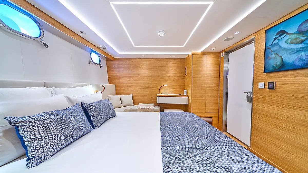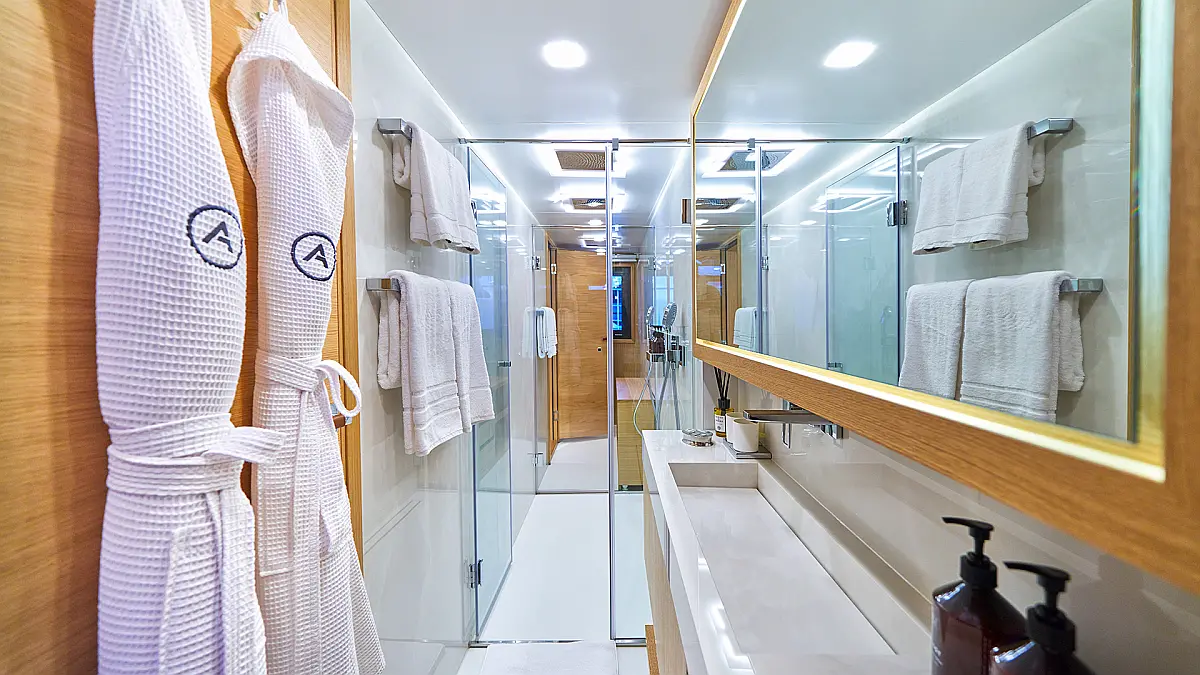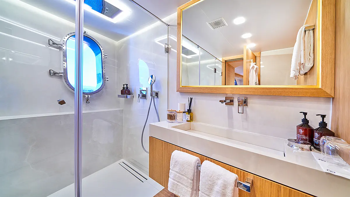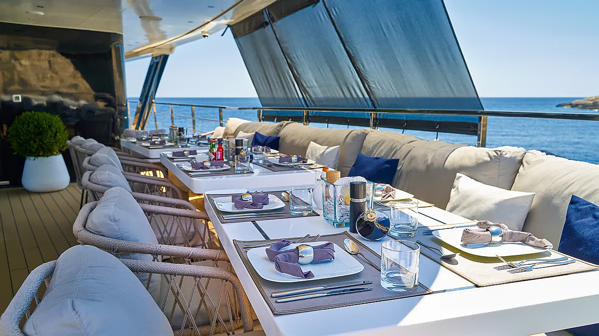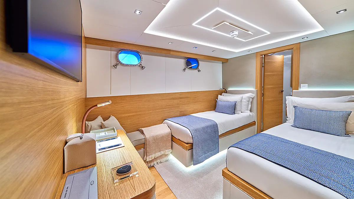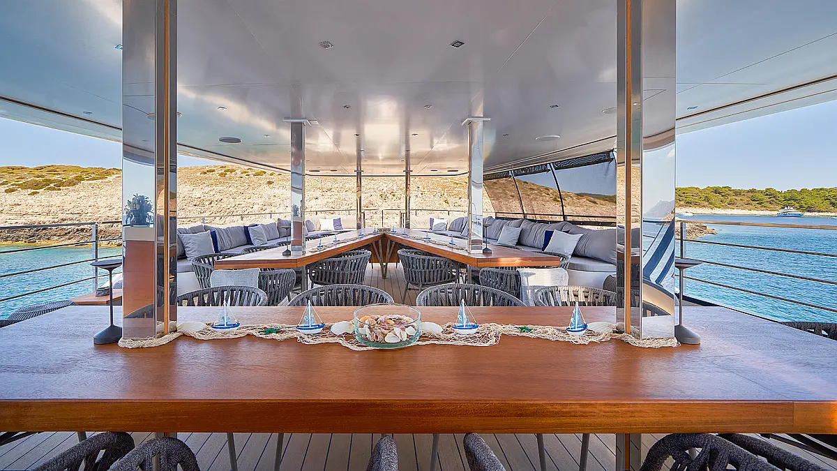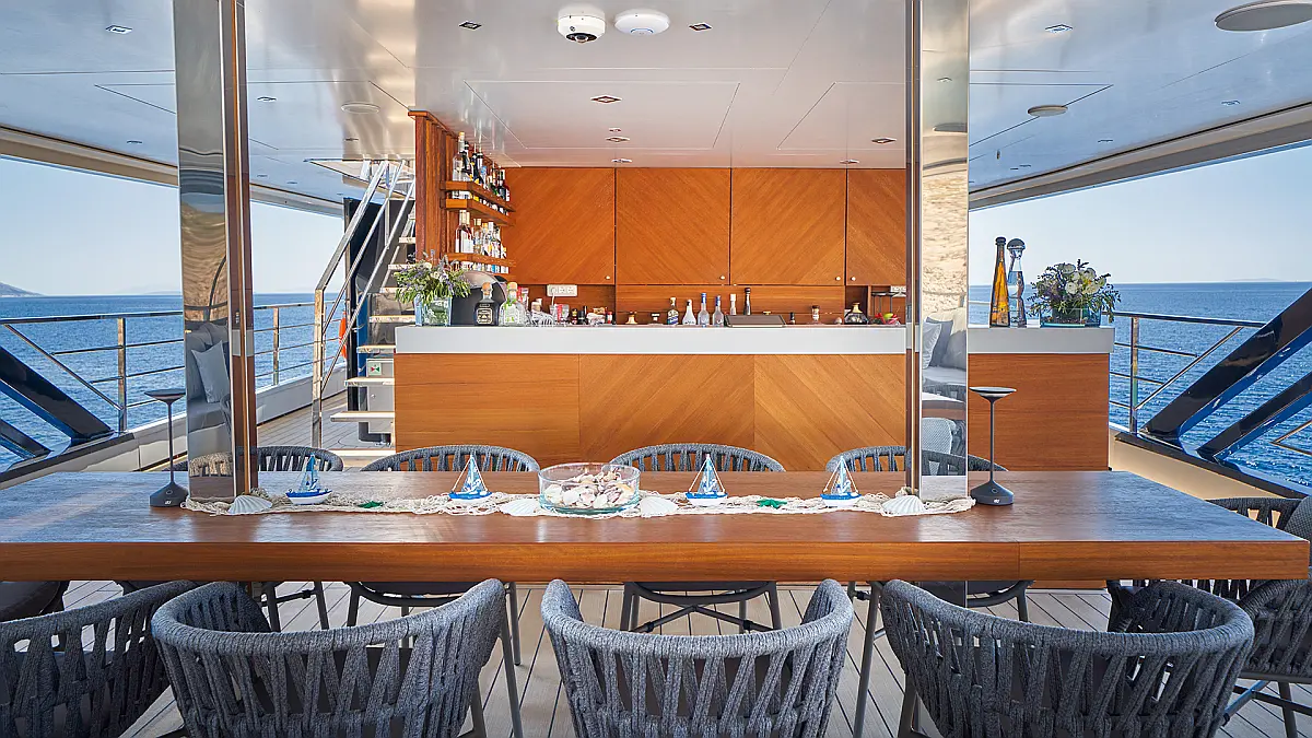 180 ft Length 13 (11 Double Cabins, 2 Twin Cabins) + crew Cabins 26 Max Guests 13 Heads Technical Specifications Draught: 10 ft Engine: BAUDOUUIN Water capacity: N/A Main sail: None Displacement: N/A Fuel capacity: N/A Beam: 30 ft Genoa: None Equipment Entertainment: Snorkeling equipment, Stand up paddle Comfort: Dinghy, Swimming pool, Air condition, Wi-Fi & Internet Documents Download Brochure Download Brochure Download Brochure