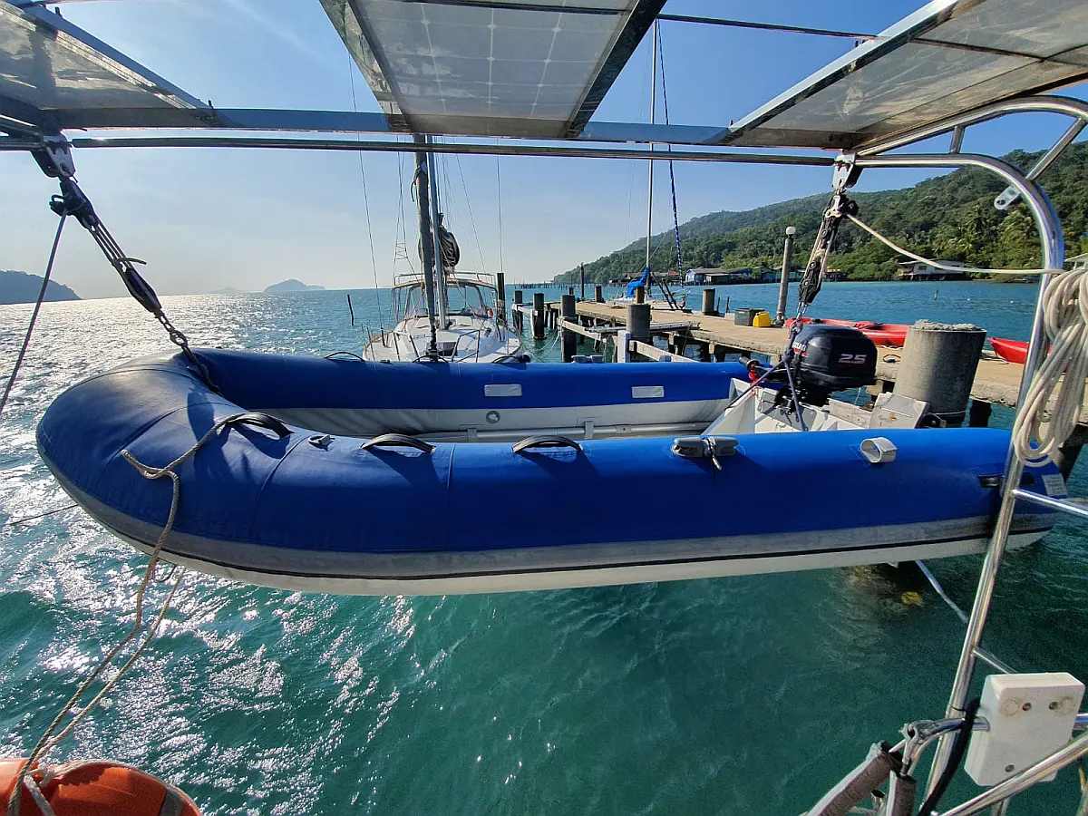 Cockpit speakers, Bimini, Refrigerator, Solar Panels, Outboard engine, Dinghy, Barbecue grill in cockpit