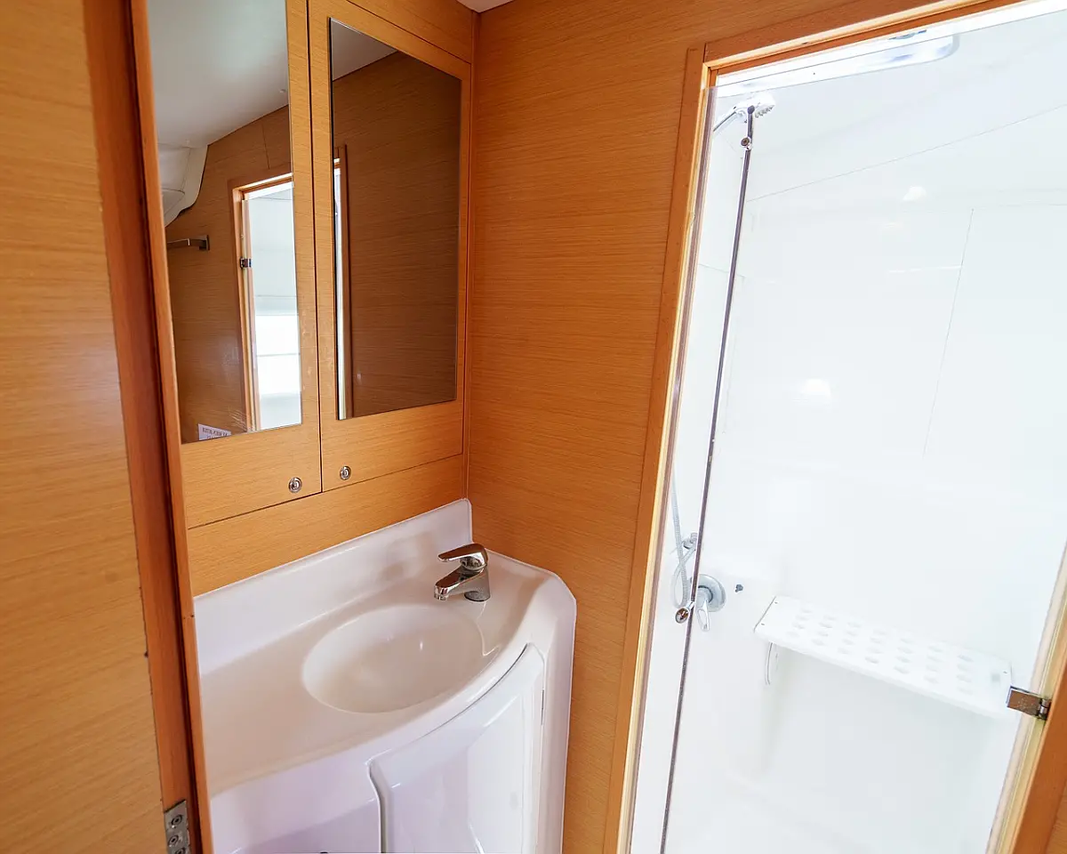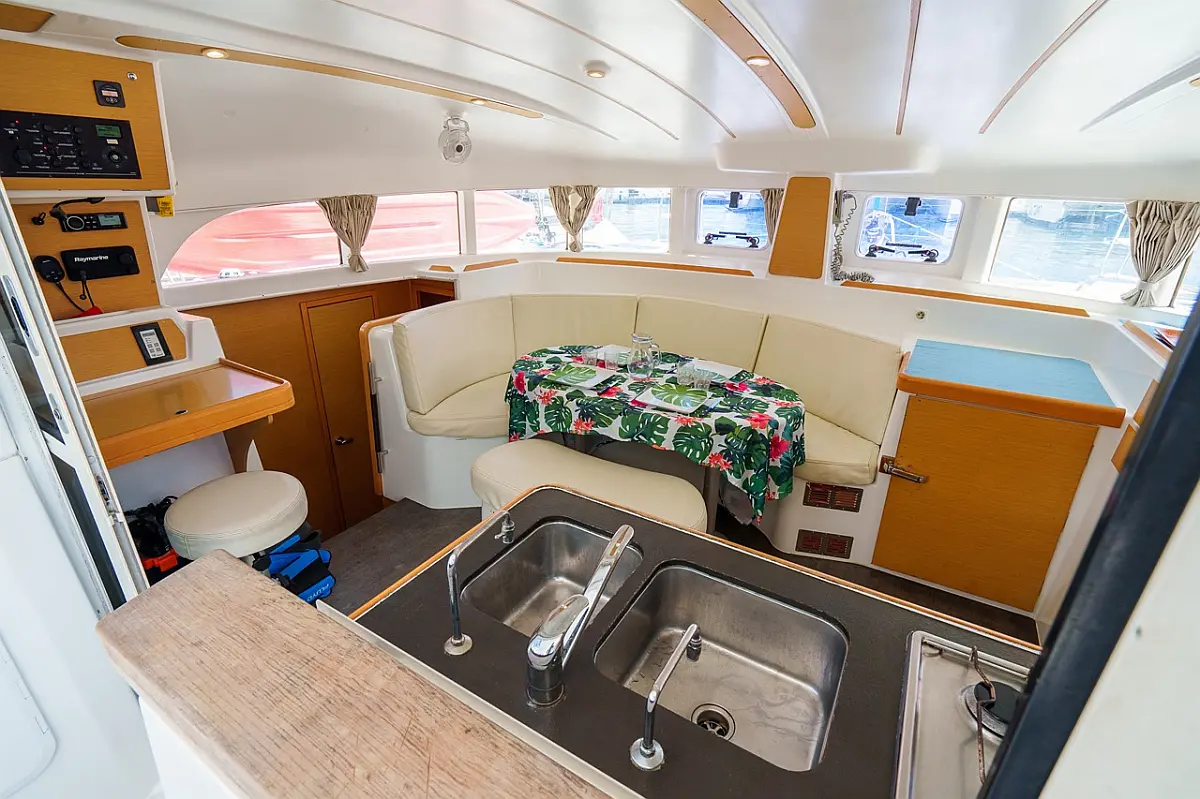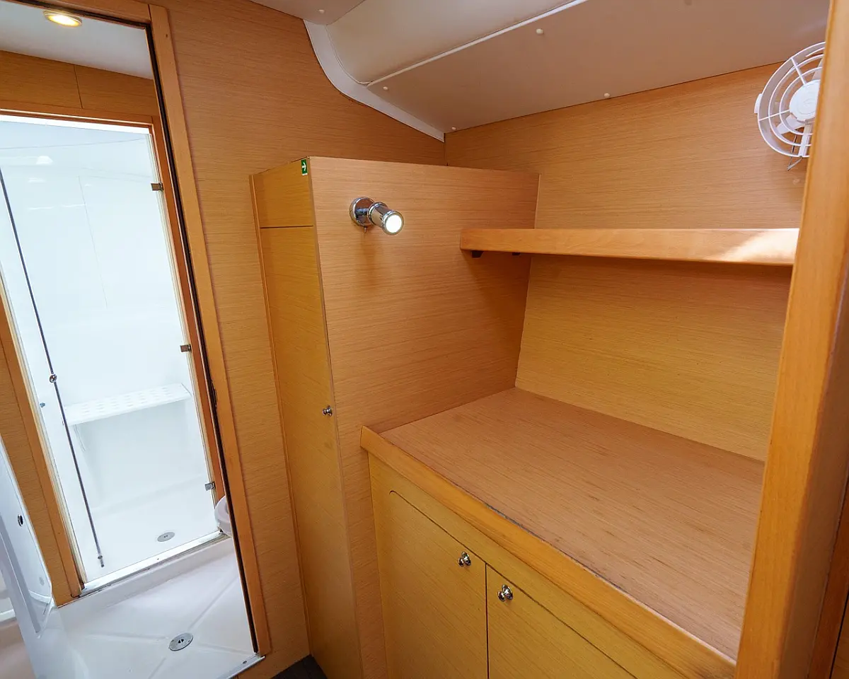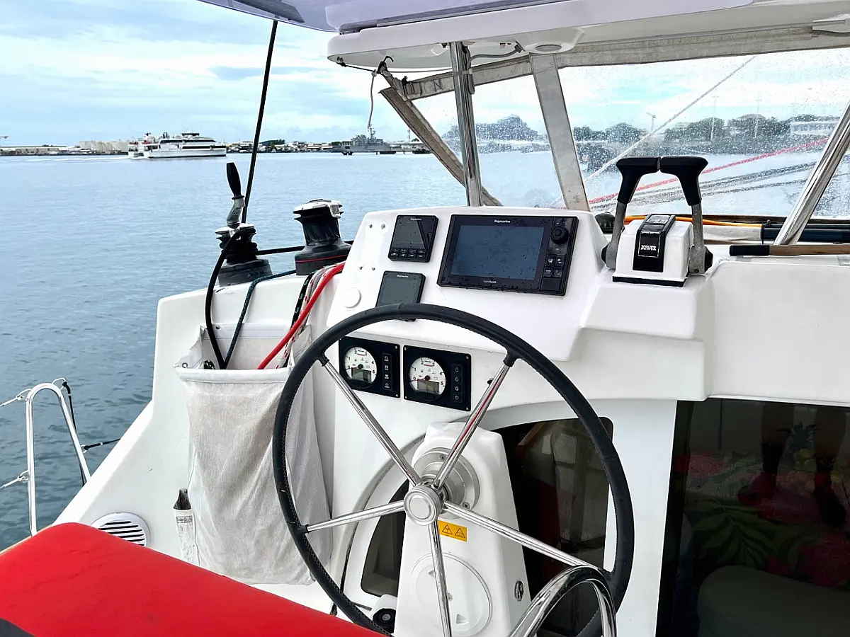 Barbecue grill in cockpit, Bimini, Cockpit cushions, Outboard engine, Refrigerator, Solar Panels, Water maker