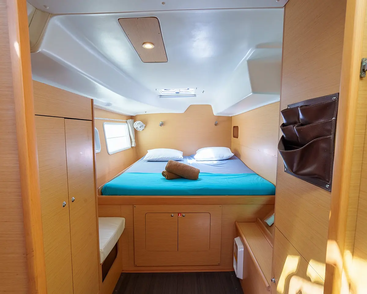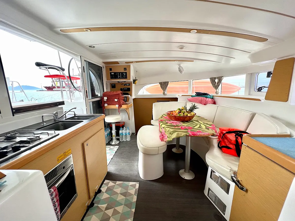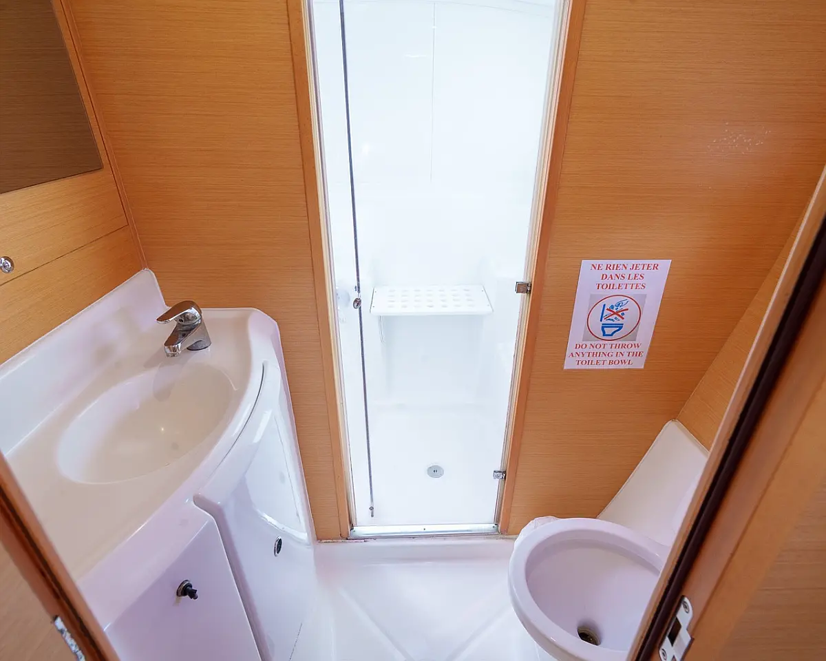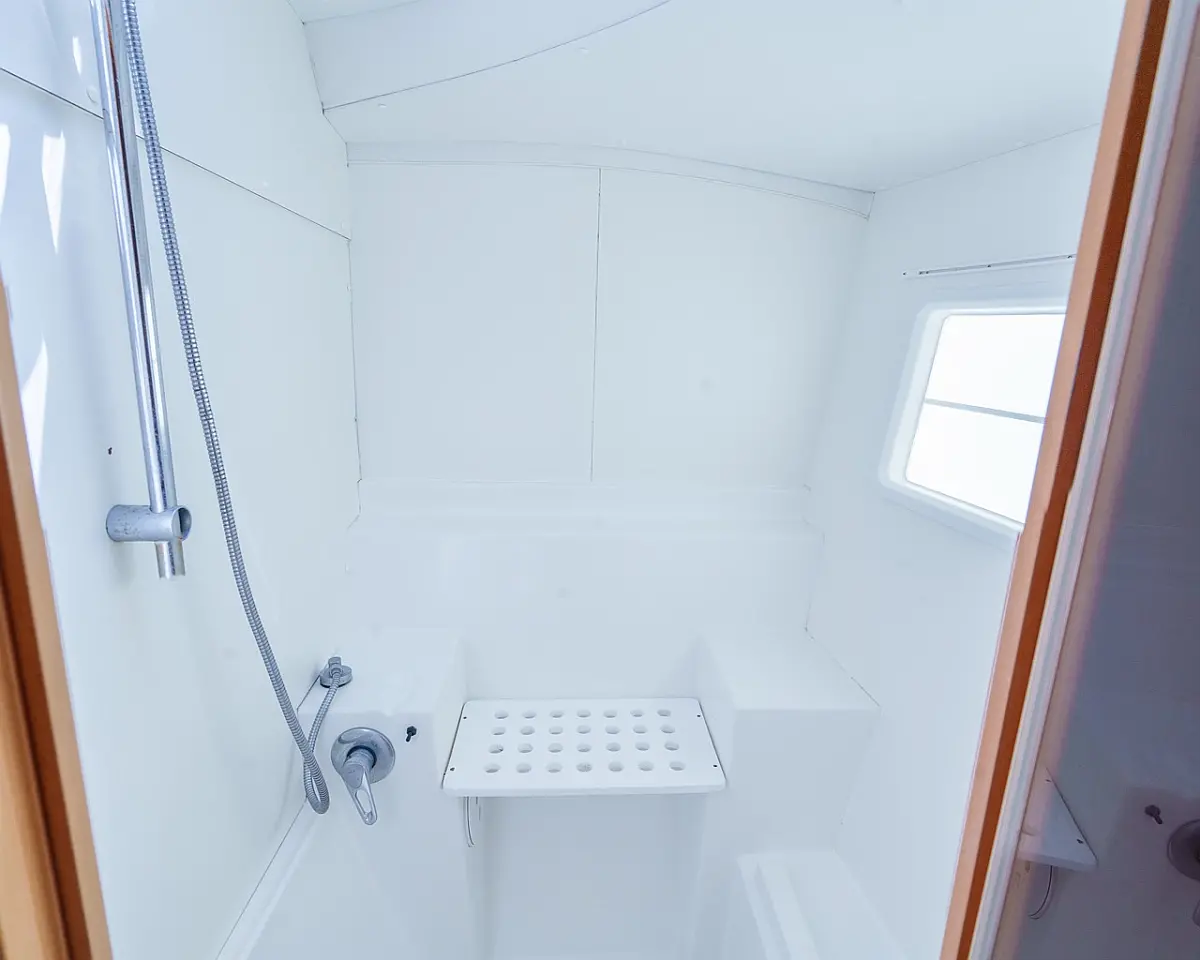 Barbecue grill in cockpit, Bimini, Cockpit cushions, Outboard engine, Refrigerator, Solar Panels, Water maker