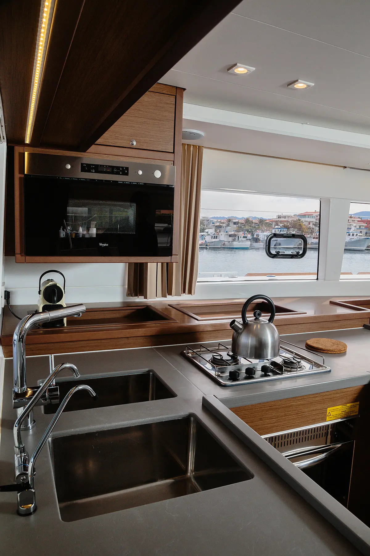 Electric winches, Air condition, Inverter, Cockpit cushions, Water maker, Generator, Electric toilet, Refrigerator
