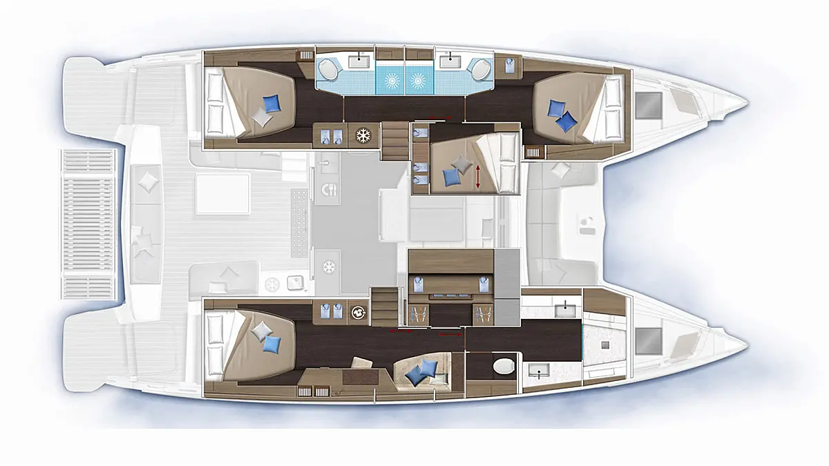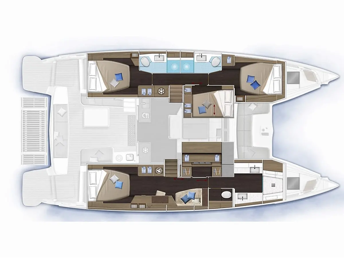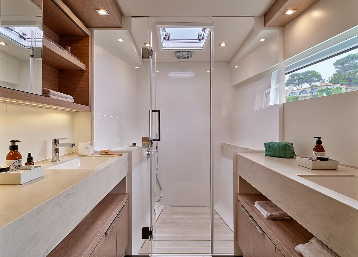 Air condition, Generator, Barbecue grill in cockpit, Electric toilet, Hydraulic gangway, Swimming platform, Inverter, Water maker, Teak deck, Ice maker