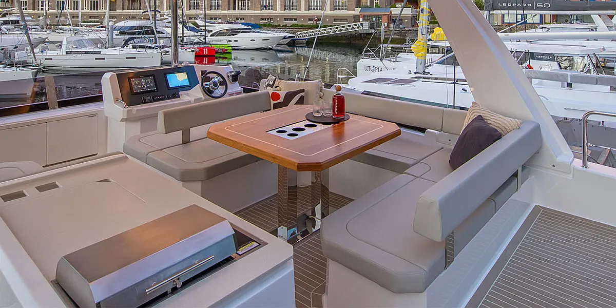 Bimini, Barbecue grill in cockpit, Cockpit speakers, Solar Panels