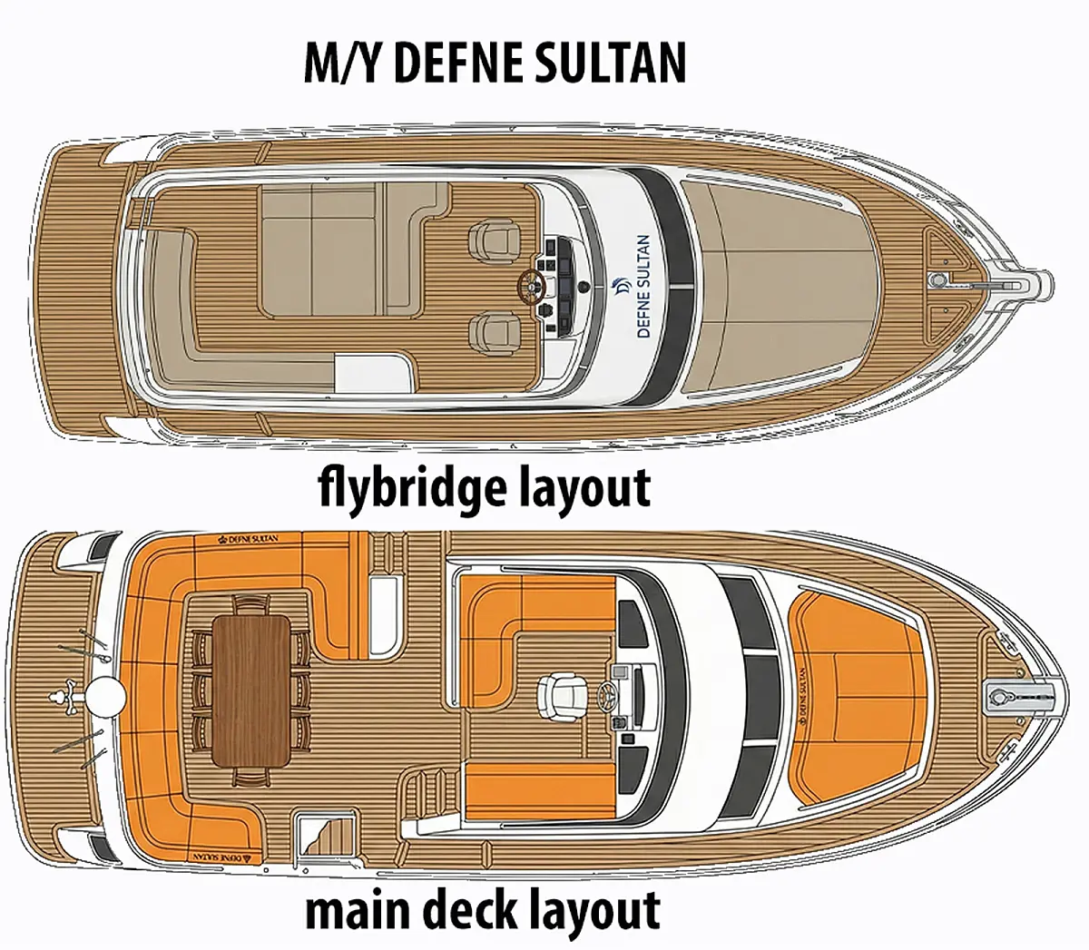 Cockpit cushions, Air condition, Refrigerator, Ice maker, Swimming platform, Coffee maker, Cockpit speakers