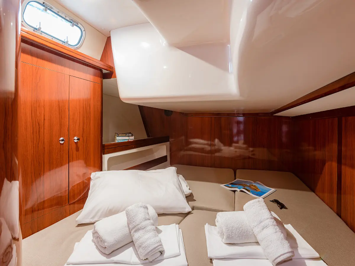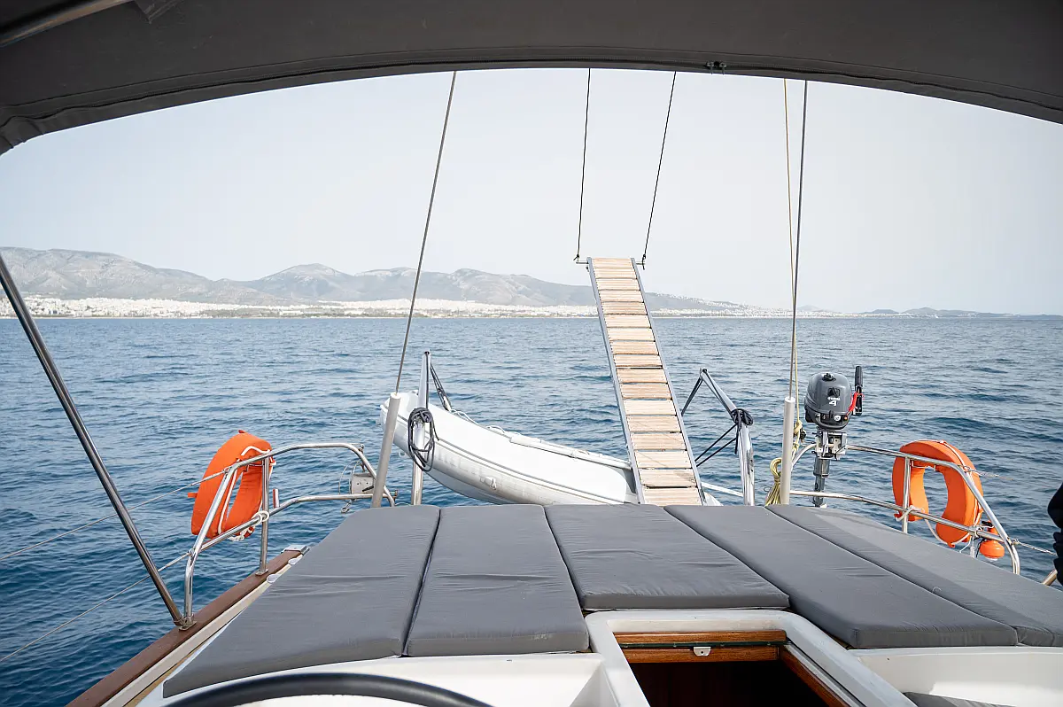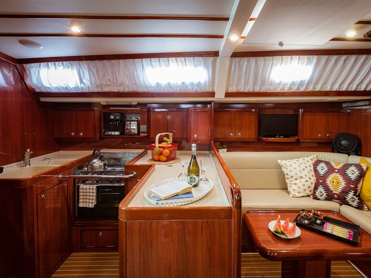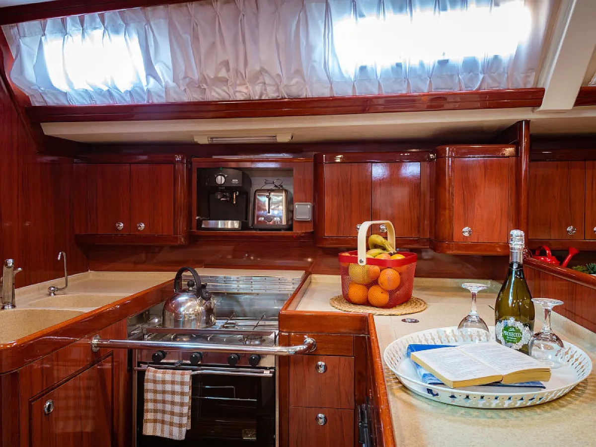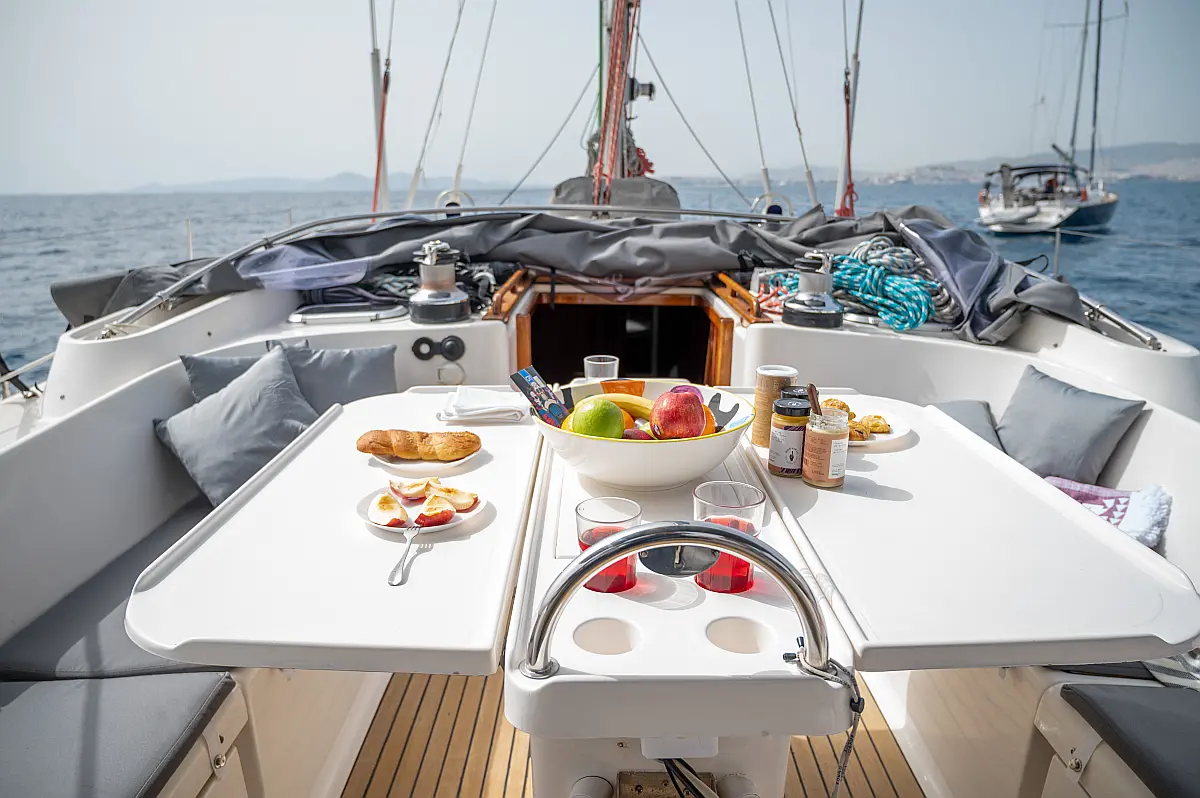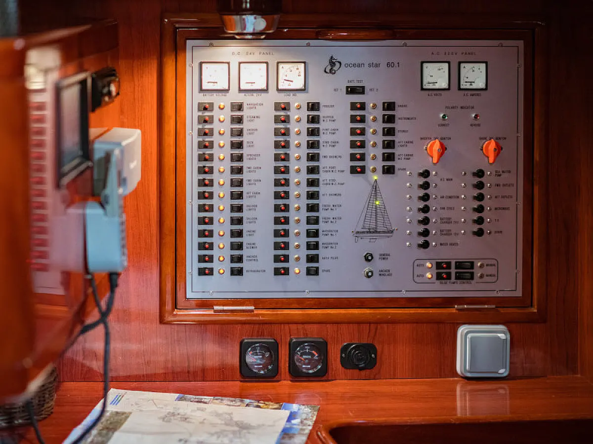 Generator, Air condition, Teak deck, Ice maker, Sprayhood, Refrigerator, Cockpit speakers, Dinghy, Bimini, Outboard engine, Water maker