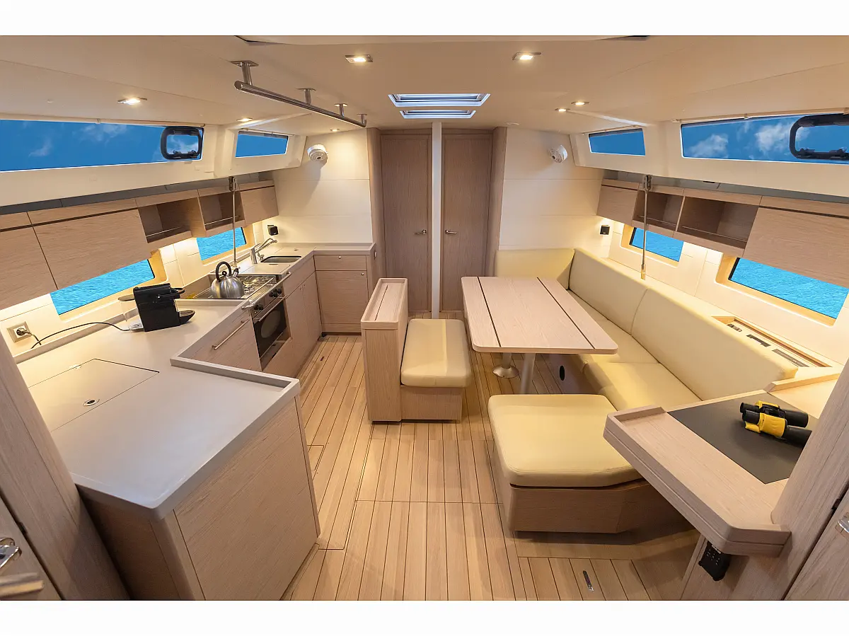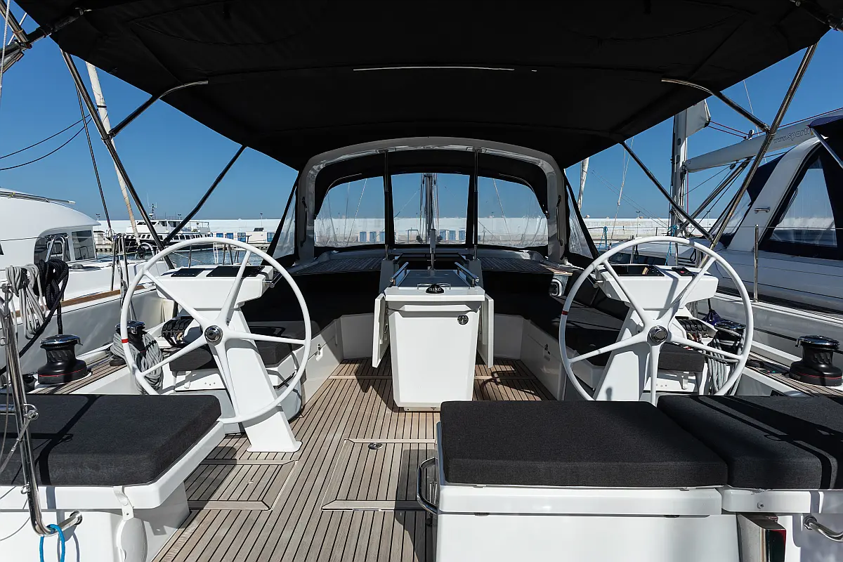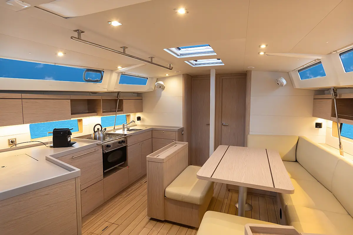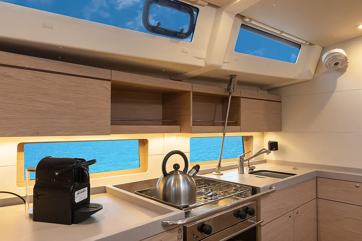Dinghy, Outboard engine, Cockpit cushions, Electric winches, Barbecue grill in cockpit, Coffee maker, Teak deck, Electric toilet, Refrigerator